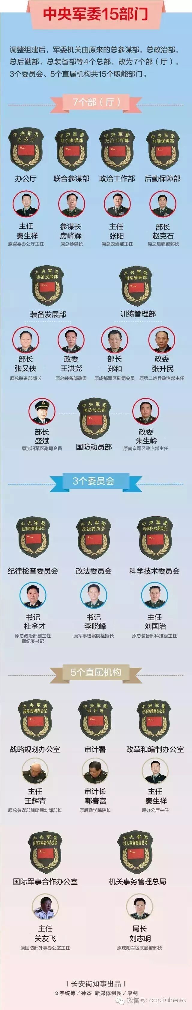 原标题:各就各位!军委机关15部门主官全部亮相 撰文|咏春 今日,随着秦生祥兼任军委改革和编制办公室主任的消息确认。军委机关15个职能部门主官,全部亮相了! 按照军委管总、战区主战、军种主建的总原则,军委机关把总部制改为多部门制,原来的总参、总政、总后、总装等4个总部,改为7个部(厅)、3个委员会、5个直属机构,共15个职能部门。 15个新部门级别高低不一 调整组建,并不只是数量上增减,还意味着部门级别的变化。 今年1月29日,《解放军报》第6版刊载《军委机关适应新体制考题四解》一文说,改革后,机关的等级降低了,领导职数减少了,“军委机关带头精简,局以上减少一个领导层级,普遍降低机构等级,大量压缩机构数量和人员编制员额”。 长安街知事(微信ID:Capitalnews)此前也曾介绍过,军委机关职能部门成立之初,出任部门主官的将领级别就各不相同。从目前公开报道的情况来看,部门级别也各不相同,这里面有大区正,也有大区副,而且大区副单位还占有一定比例。 相对于原先四总部的级别,这15个新职能部门,级别普遍降低了。 部门架构“看齐”中央部委 军改前的军委机关,大致分总部、二级部、局、局以下参谋四个层级。军改后则形成了部、局、处三级架构,与中央各部委架构一致。 比如年初的中华医学科技奖2015年度颁奖大会上,李清杰以军委后勤保障部卫生局局长的身份出席并颁奖,此前他是总后勤部卫生部部长。军改后出任军委装备发展部合同监管局局长的曾佑铭,此前曾担任总装综合计划部预研局局长等职务。 从两位将军职务名称变化可以看出,他们所在机构原来的总部、二级部、局隶属关系中,二级部这一层次已经消失。军委机关的管理架构也更趋向“扁平化”。 原四总部主官仍对应新部门一把手 调整之后,原四总部的主官,仍担任相对应的新部门“一把手”。 总参谋长房峰辉,担任联合参谋部参谋长;总政治部主任张阳,担任政治工作部主任;总后勤部部长赵克石,担任后勤保障部部长;总装备部部长张又侠、政委王洪尧,仍分别担任装备发展部的部长、政委。除王洪尧外,其他4位主官,还是中央军委委员。 长安街知事(微信ID:Capitalnews)发现,各部门主官中,还有3人也来自原四总部。他们是:军委纪委书记杜金才,此前是总政副主任兼军纪委书记;科技委主任刘国治,此前是总装科技委主任;战略规划办主任王辉青,此前任总参战略规划部部长。 原七大军区,如今已成历史。原大军区的一些高级军官,此次被任用到军委机关,掌管新的职能部门。 如训练管理部部长郑和,他原是成都军区副司令员。国防动员部的部长、政委两位主官,都是从大军区调过来,部长盛斌,原是沈阳军区副司令员;政委朱生岭,此前是南京军区政治部主任。机关事务管理总局局长刘志明,此前是沈阳军区联勤部部长。 仅有王成志将军职务尚未确定 军改后,军委机关新部门的定位有了变化,从“总部领导机关”转变为“军委办事机关”,“领导”色彩淡化了,“指导”“办事”的功能突出了。这就必然要求部门的主官,对业务要更加精通、娴熟。 此次履新的部门主官,不少是“行家里手”。政法委书记李晓峰,有军事检察院检察长的履历;科技委主任刘国治,此前在总装科技委任职;战略规划办公室主任王辉青,原来担任总参战略规划部部长。 国际军事合作办公室主任关友飞,原是国防部外事办公室主任;审计署审计长郭春富,曾担任过解放军审计署副审计长职务。 当初在15个职能部门成立大会上亮相的诸多将领,如今一一对应亮相。只有原总政直属工作部政委王成志的新职务没有确定,按当时央视新闻画面的座次,王成志排在现任军委机关事务管理总局局长刘志明之后。 责任编辑:孙爱林 SN146 |